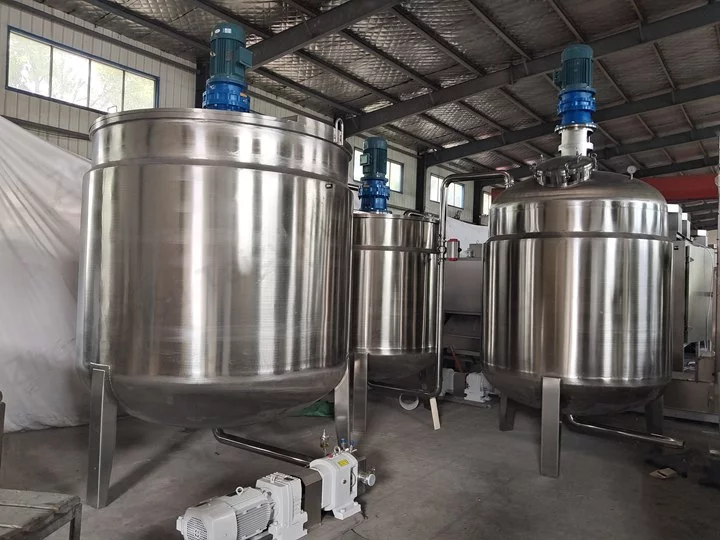 A peanut mixing tank is a piece of equipment used for blending, heating, emulsifying, and mixing raw materials. The material is stainless steel. The mixing tank is composed of a mixing tank body, mixing tank cover, agitator, support, transmission device, shaft seal device, etc. A vacuum tank can remove the air to extend the shelf life of peanut butter.